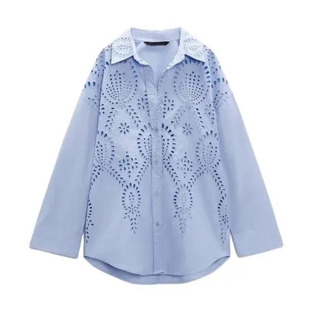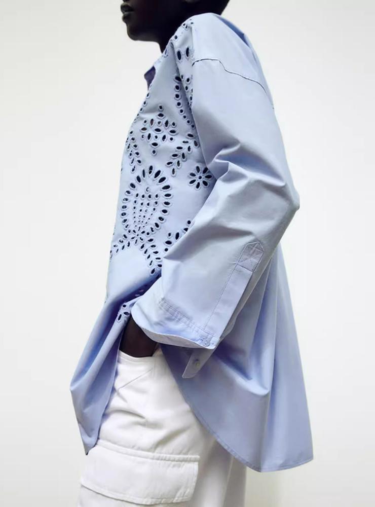قميص ربيعي فضفاض ومريح بتطريز وتخريم أنيق